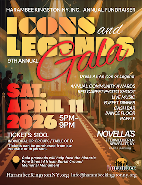 Sat, Apr 11 from 5:00pm to 9:00pm9th Annual Harambee Kingston NY, Inc Gala Fundraiser ICONS and LEGENDS Saturday, April 11, 2026 . 5pm – 9pm Novella’s – 2 Terwilliger Ln. New Platz, NY Gala Tickets: $100.00 per person Join us to for our annual Community Awards, DJ Apollo, Buffet, Dinner, Cash Bar, Raffles, Red Carpet Photoshoot. Come dressed as an Icon or Legend.